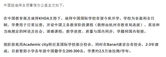 筹建中的迪拜中国国际学校(杭州第二中学迪拜学校)是一所涵盖幼儿园、小学、初中、高中15年制的非盈利全日制学校,规划规模为在校生1800人,小学部计划今年秋季开学,拟招收1-5年级学生,以后逐年拓展招生学段。学校按照阿联酋法律设立,具有独立法人资格,在迪拜开展教育活动,依法享有民事权利,独立承担法律责任。迪拜中国国际学校也将受中国教育部、浙江省教育厅和迪拜教育局监管。